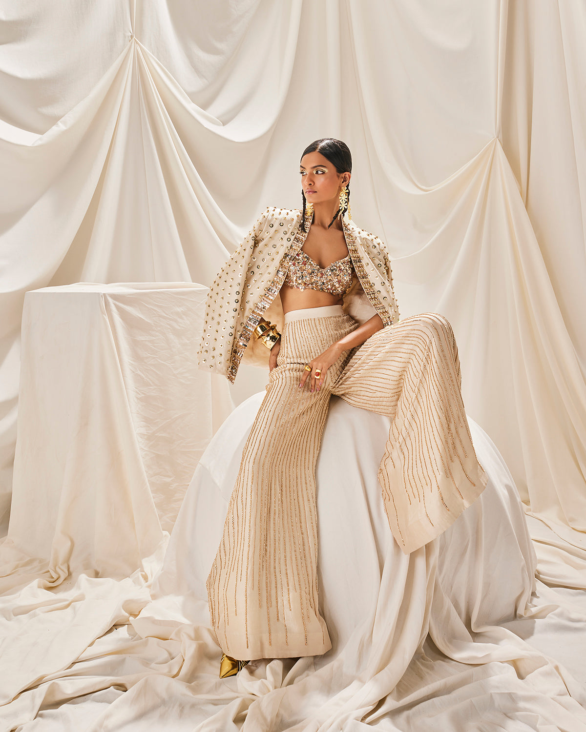 YELLOW HIGH NECK CUT OUT CROP WITH SEQUENCE + PANT WITH RICK RACK